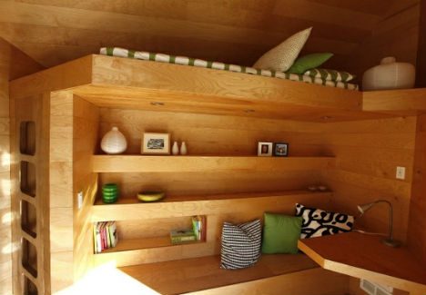 Đó là sự kết hợp hoàn hảo. Chỉ với gần 10m2, bạn đã có một căn nhà đẹp, không gian sống tuyệt vời. Không phải là chiếc giường tầng bình thường mà là sự kết hợp, hòa trộn giữa vẻ đẹp tinh tế và sự tiện tích. Tầng trên giống như giường tầng bình thường, nhà thiết kế khéo léo làm một chiếc bàn gấp đựng đồ. Phía dưới là chiếc giường nhỏ, nếu không dùng thì bạn có thể dùng làm bàn tiếp khách. Phía trên đầu là một thanh ngang, nơi bạn có thể đựng sách, bình hoa trang trí. Cầu thang đi lên phía tầng trên là những ngăn hộc đựng đồ được thiết kế đồng bộ.