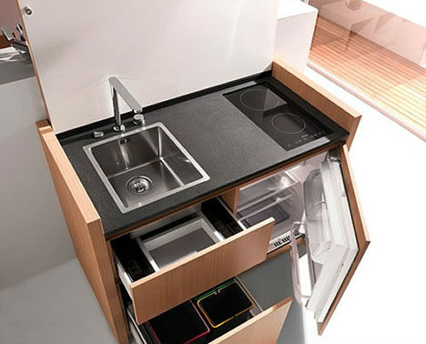 Bồn rửa, bếp, máy rửa bát, các loại dụng cụ nhà bếp khác… được lắp đặt thông minh trong một chiếc tủ nhỏ xinh. Nếu bạn không sử dụng nữa thì lật nắp tủ lại. Nó sẽ biến thành một chiếc bàn xinh xắn.