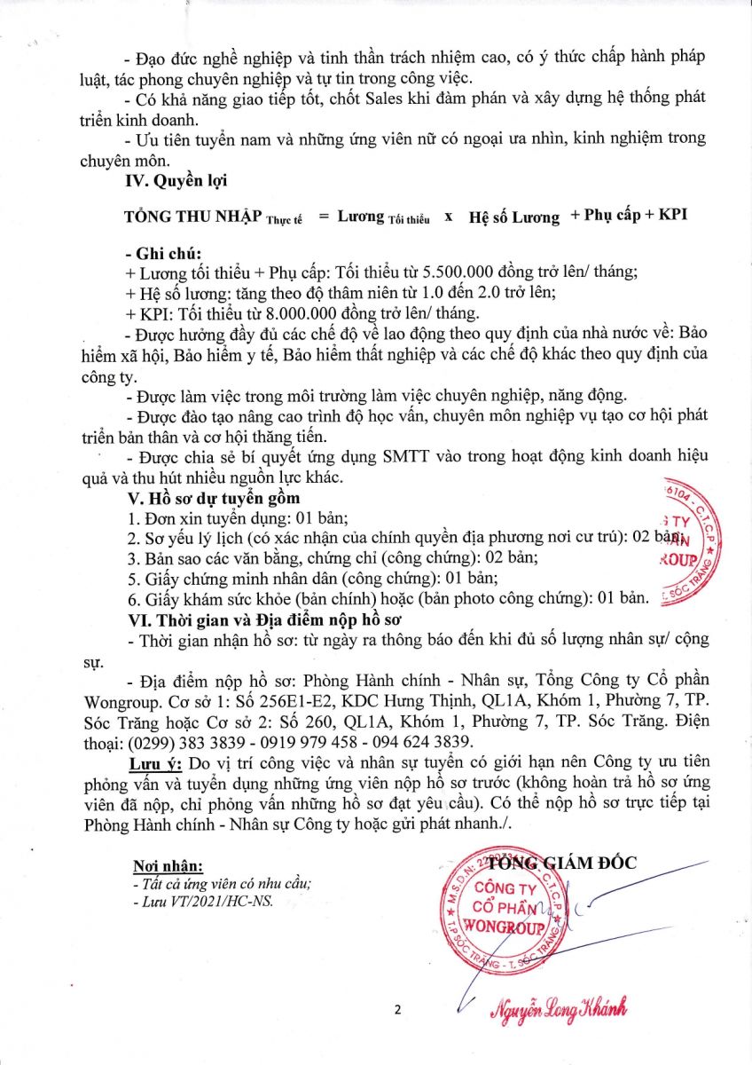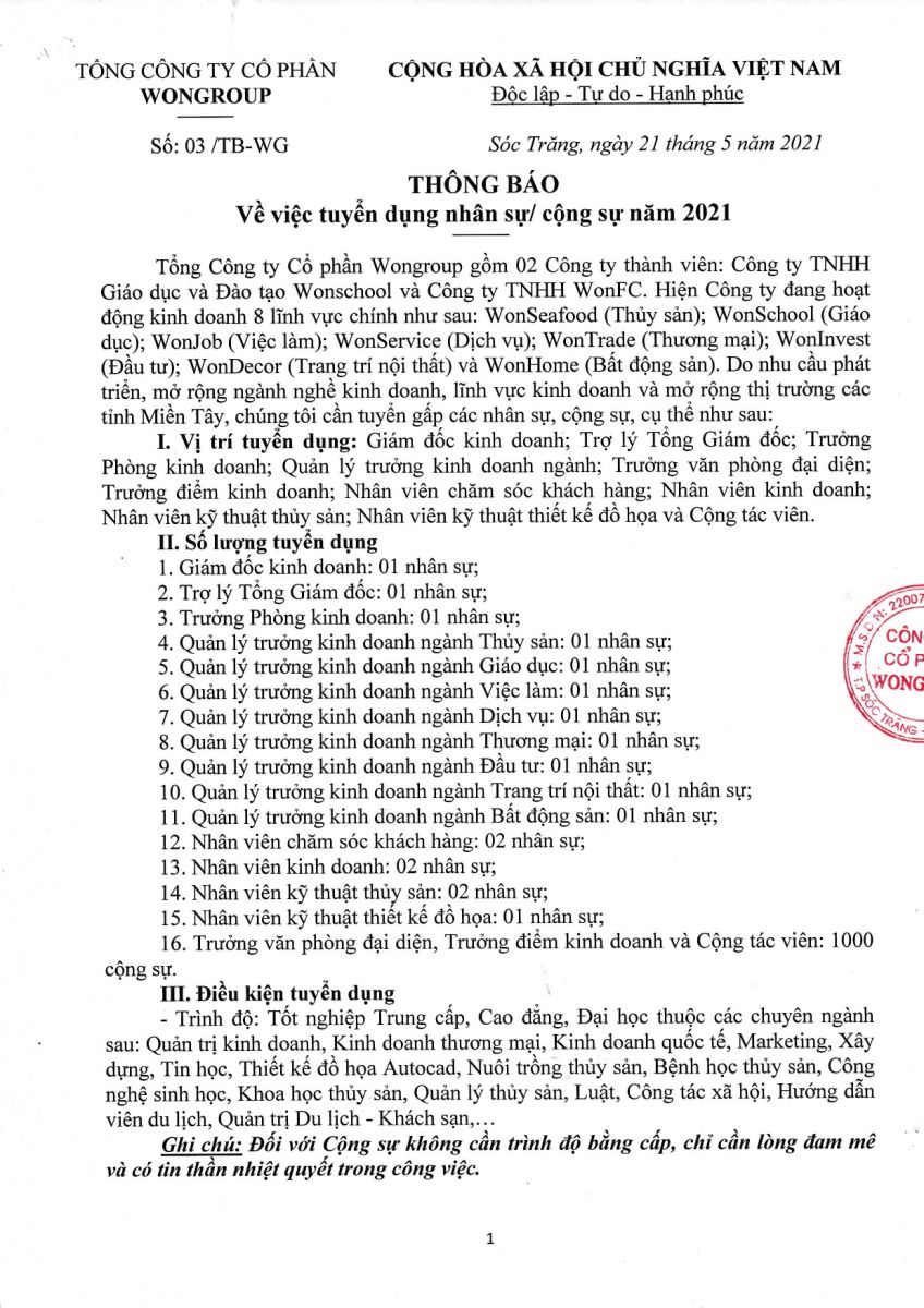 THÔNG BÁO TUYỂN DỤNG TỔNG CÔNG TY CỔ PHẦN WONGROUP