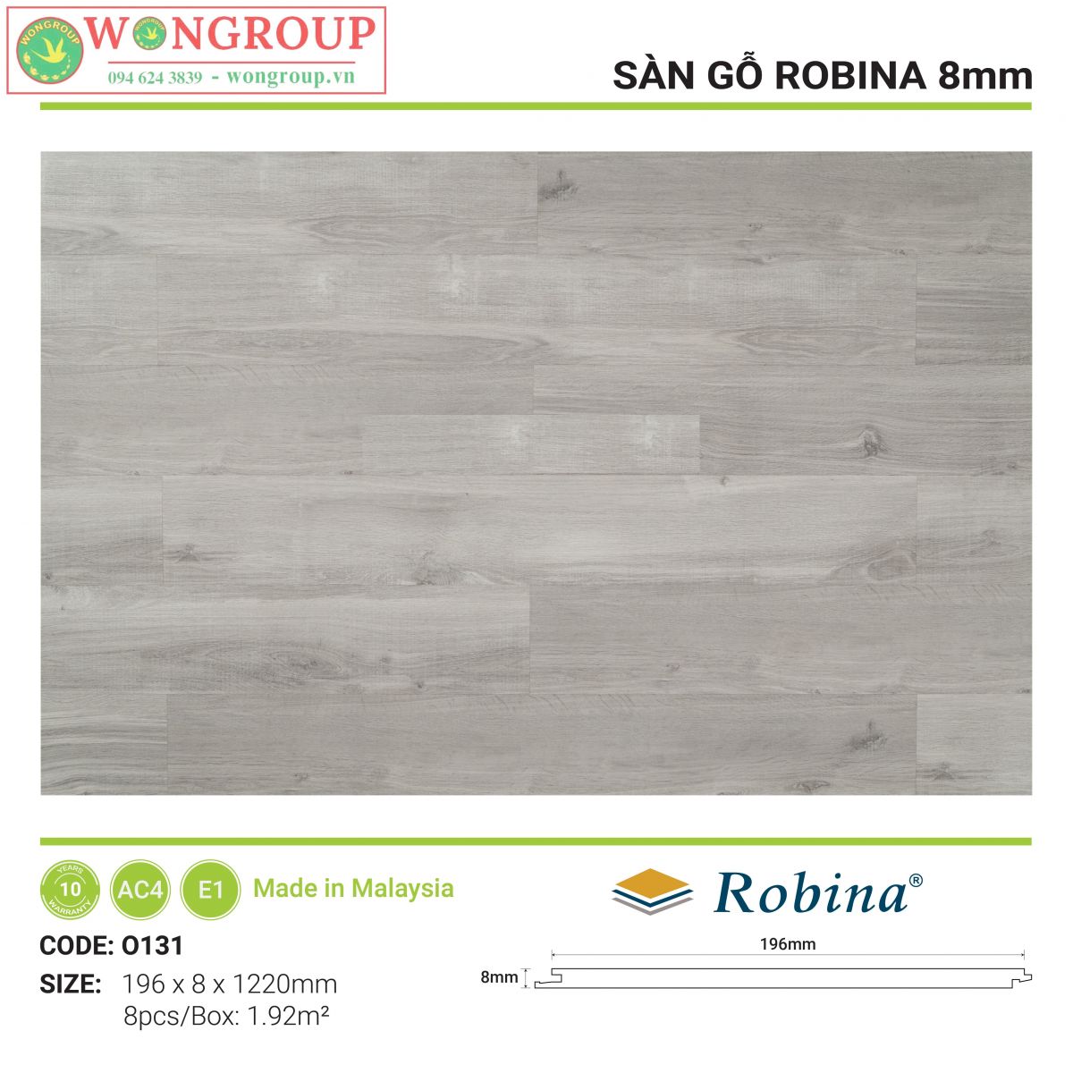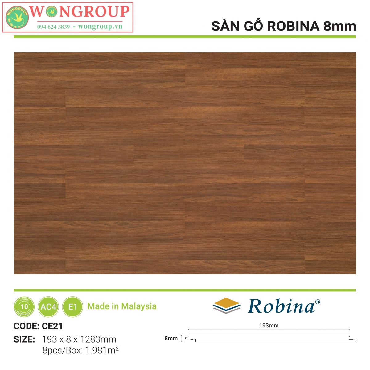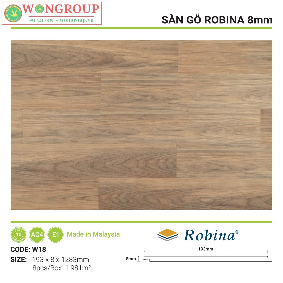 Sàn gỗ Robina là sàn gỗ Malaysia nhập khẩu trực tiếp từ nhà máy Robina Flooring Sdn Bhd – nhà máy có hơn 20 năm kinh nghiệm trong lĩnh vực sản xuất sàn gỗ công nghiệp tại Malaysia. Sàn gỗ Malaysia Robina có cốt HDF được làm từ gỗ nhiệt đới, mang tính năng chống mối tuyệt vời với chính sách bảo hành mối mọt và chất lượng 10 năm.