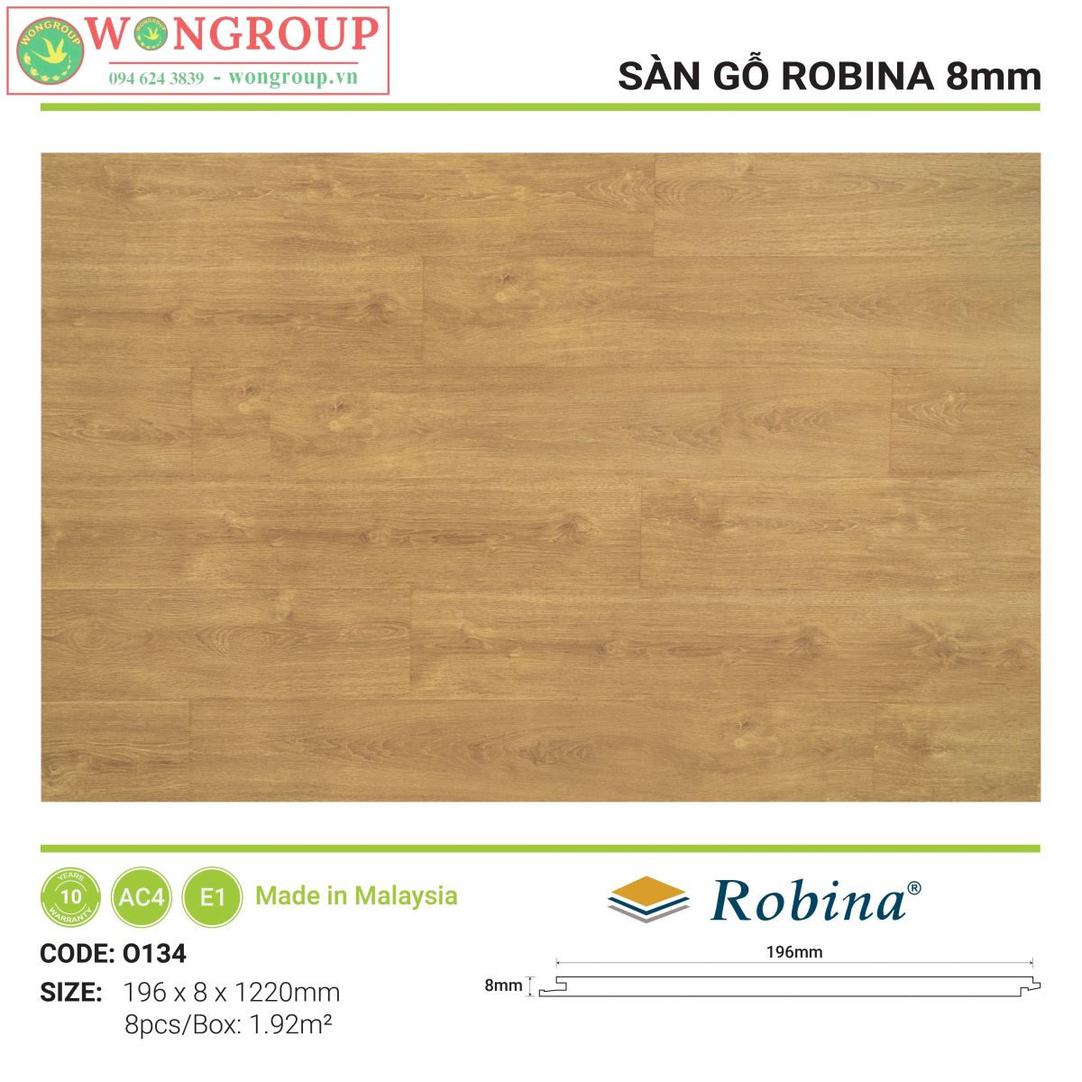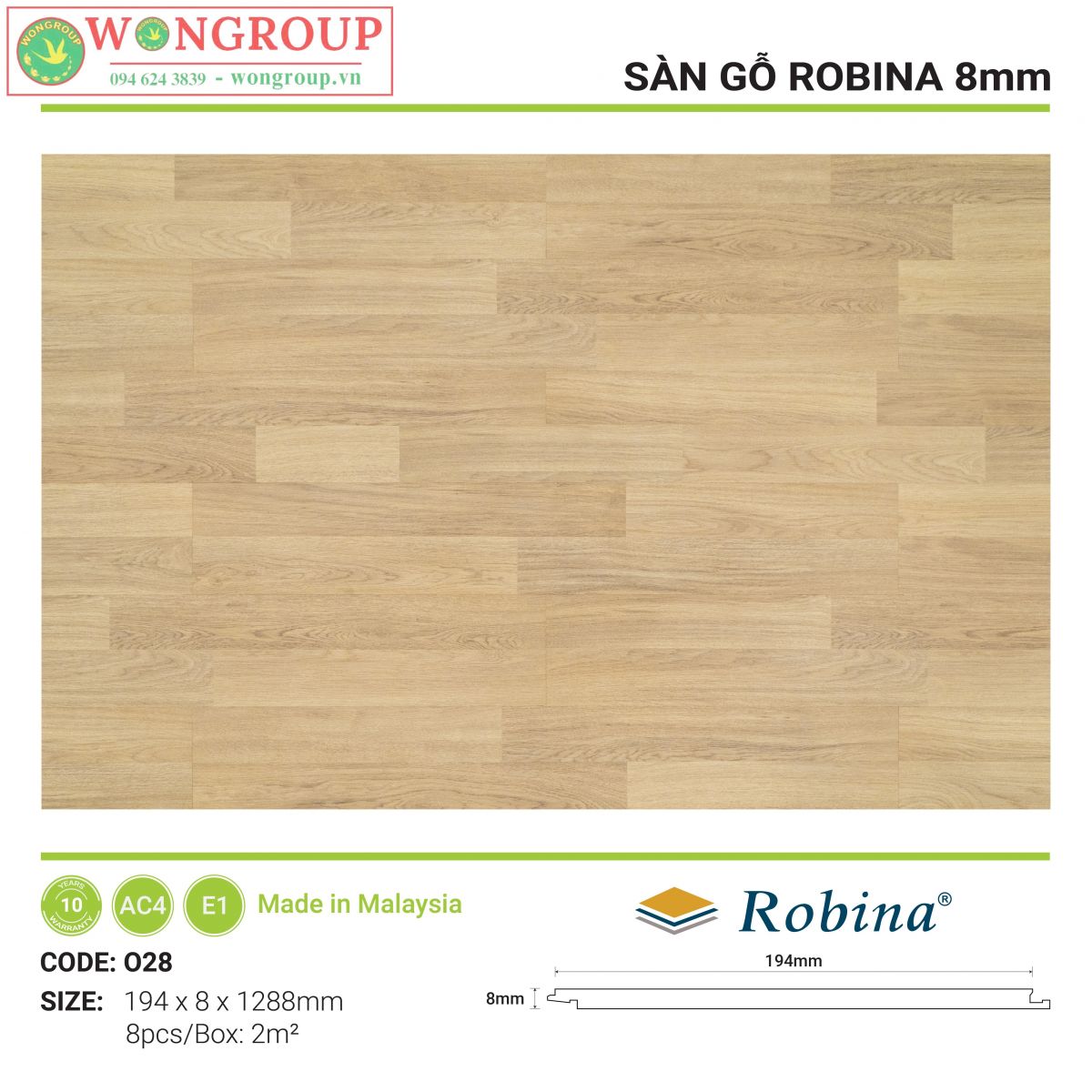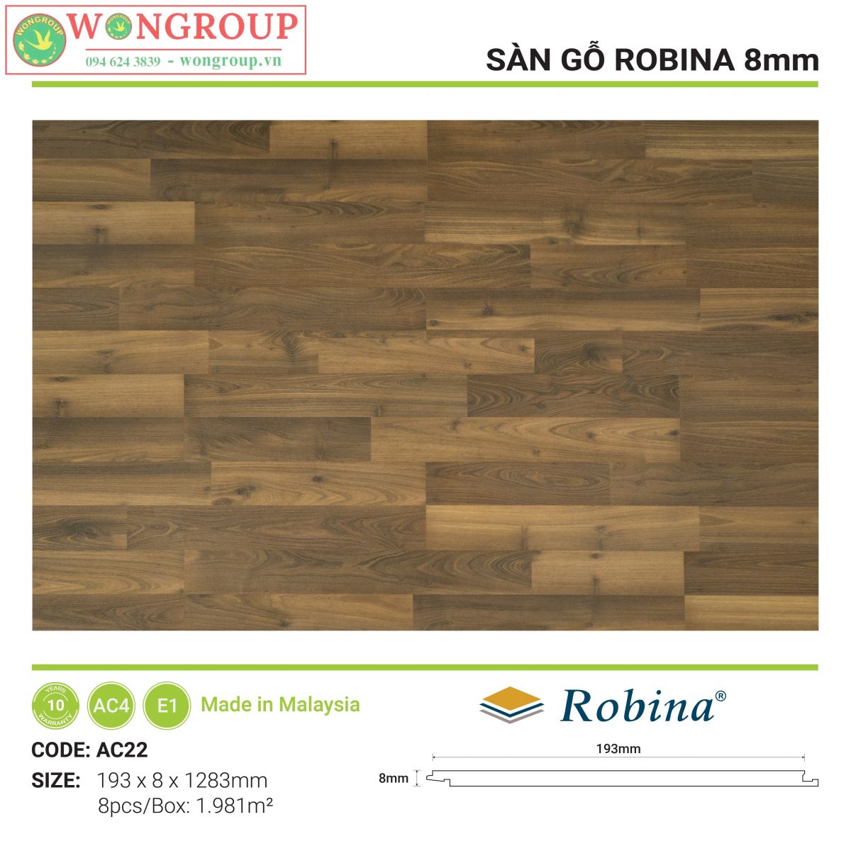 Sàn gỗ Robina là sàn gỗ Malaysia nhập khẩu trực tiếp từ nhà máy Robina Flooring Sdn Bhd – nhà máy có hơn 20 năm kinh nghiệm trong lĩnh vực sản xuất sàn gỗ công nghiệp tại Malaysia. Sàn gỗ Malaysia Robina có cốt HDF được làm từ gỗ nhiệt đới, mang tính năng chống mối tuyệt vời với chính sách bảo hành mối mọt và chất lượng 10 năm.